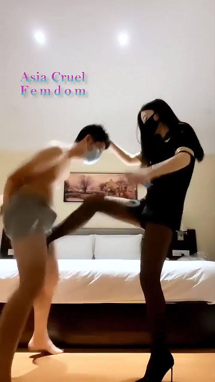 The gorgeous stewardess viciously kicks her male slave for fun and sport. No consideration for the slave’s feelings. Wears all sorts of different shoes. Orders the slave to use different positions. Totally ballbusting torture! She completely treats this poor slave as a toy for her personal venting!